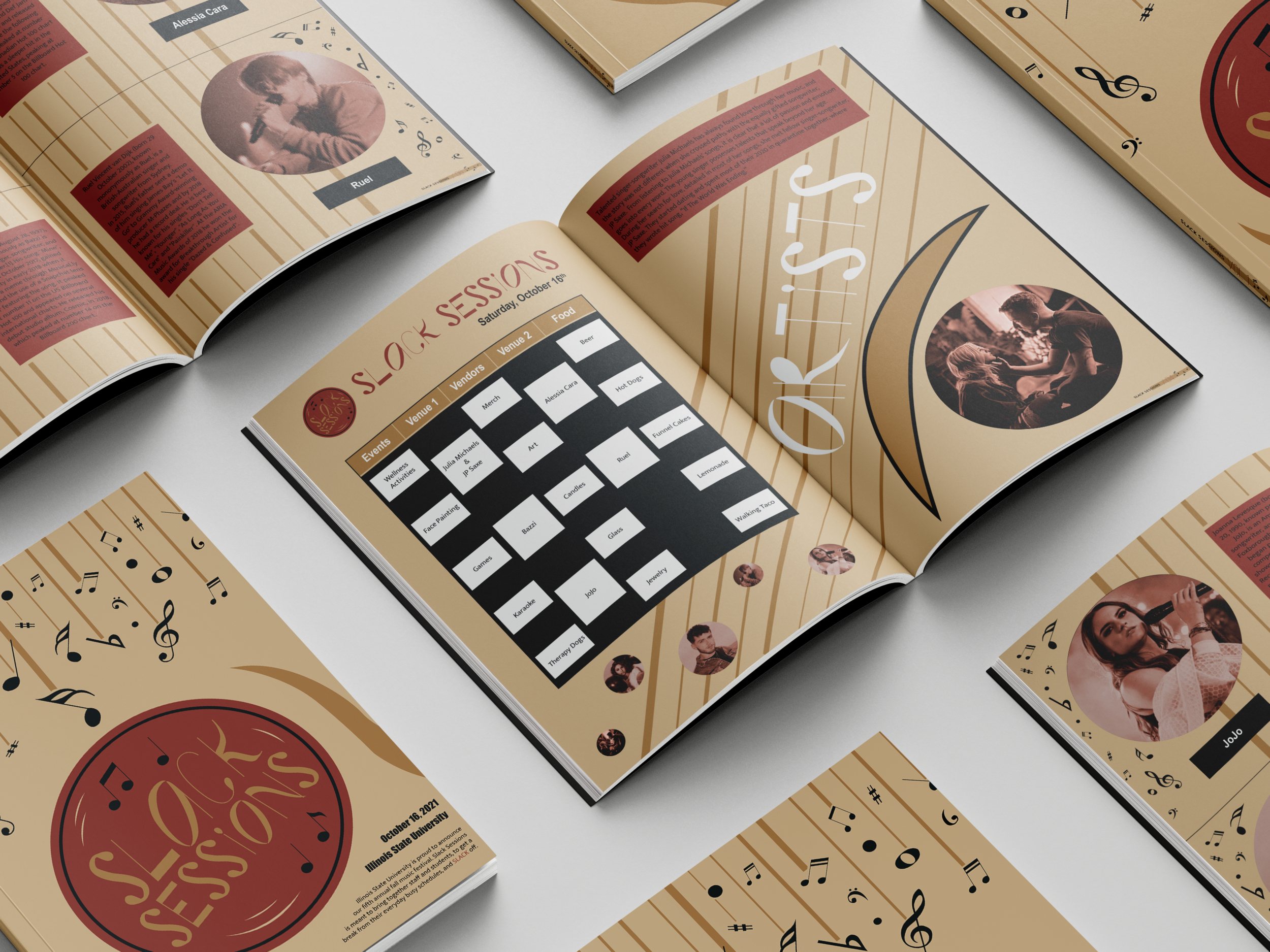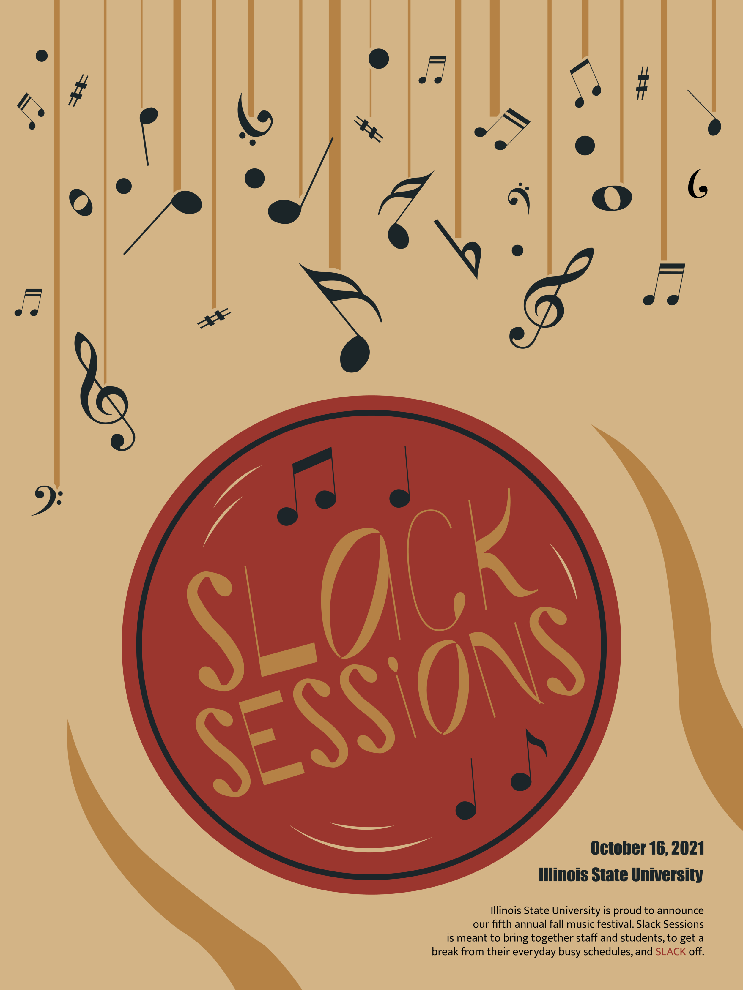This project was our final one in a Typography class, allowing us to use an accumulation of all the skills we had learned throughout the course of the class. The premise was to create a typographic identity for some type of conference, workshop, or festival on our campus of Illinois State University. I chose to do a musical festival, with various smaller known artists, that would include a variety of booths of local cuisines and artist popups. We were to use a modular kit of parts throughout our design, mine being a typeface I created from musical notes seen in sheet music. I used parts of this kit all through my design, be it on the event poster or the informational booklet trying to create a cohesive look, while using colors similar to the ones seen on the Illinois State emblem.